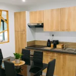 Lumineuse et entièrement équipée, la cuisine offre tout le confort nécessaire, tandis que la salle de bain, aux élégants accents de marbre, séduit par son éclairage doux et sa douche à l’italienne.
