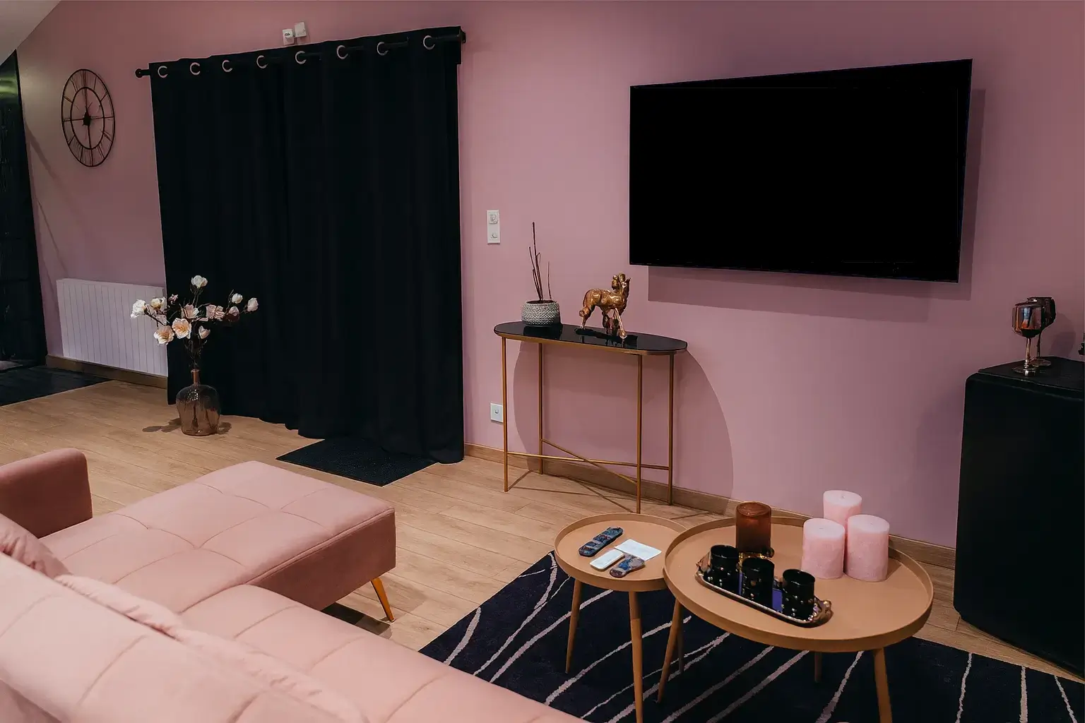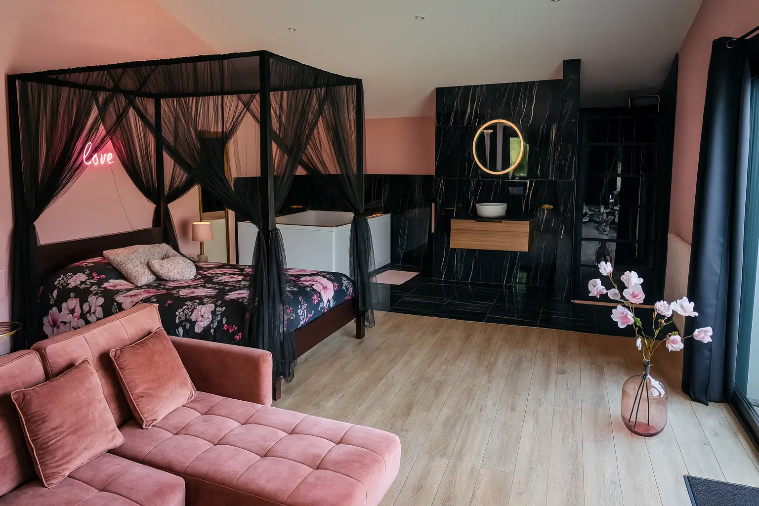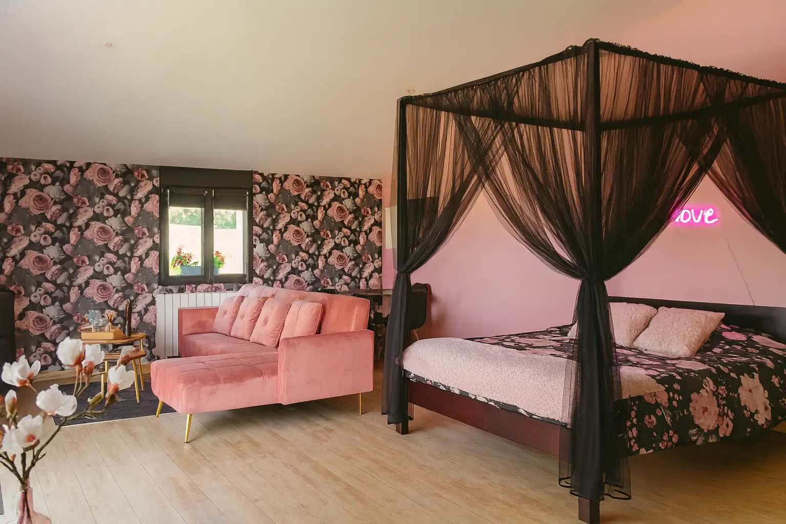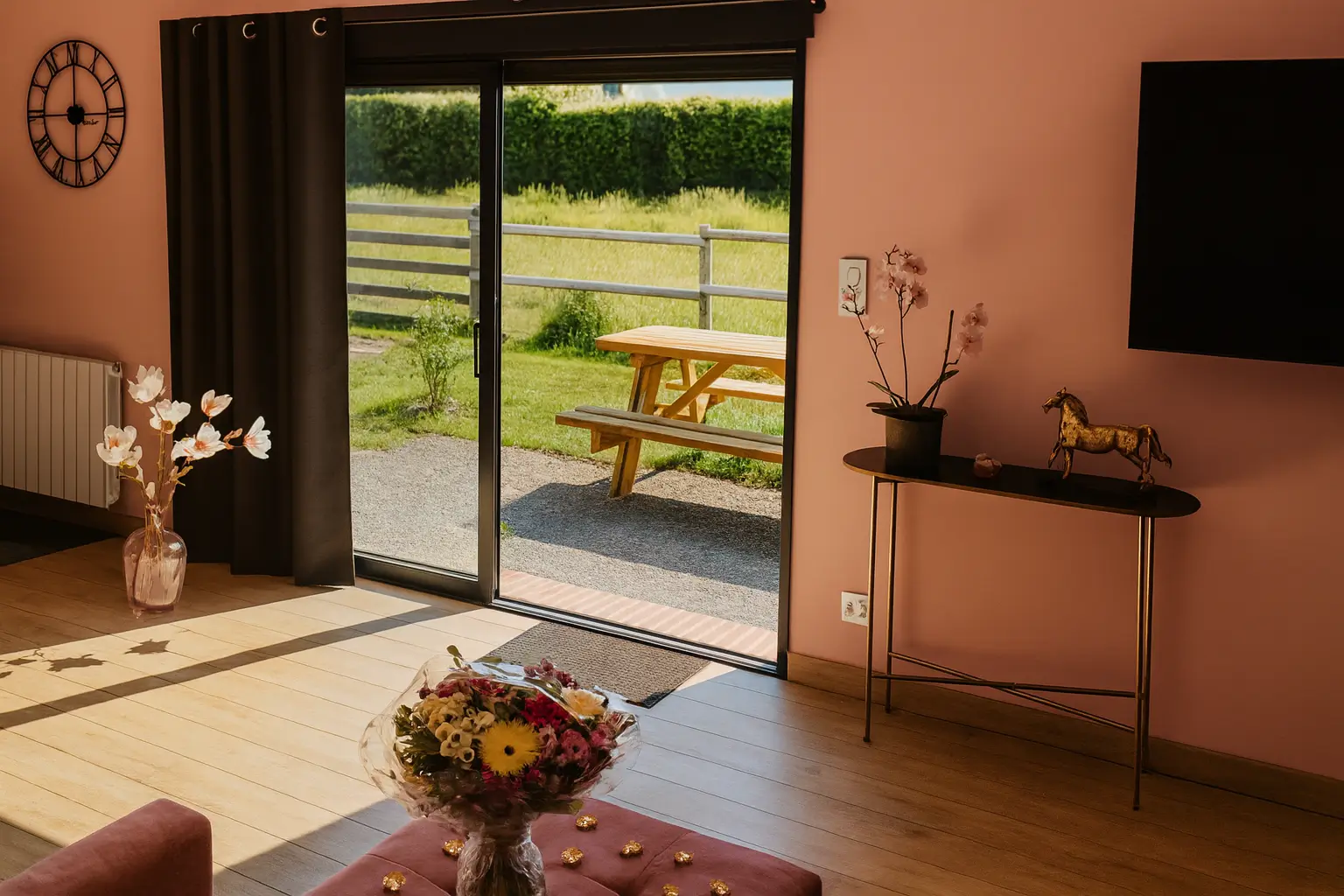 La décoration, délicatement teintée de rose, crée une atmosphère douce et féminine, tandis que la terrasse privée donne sur un paisible panorama des animaux de la mini ferme, invitant à la contemplation.