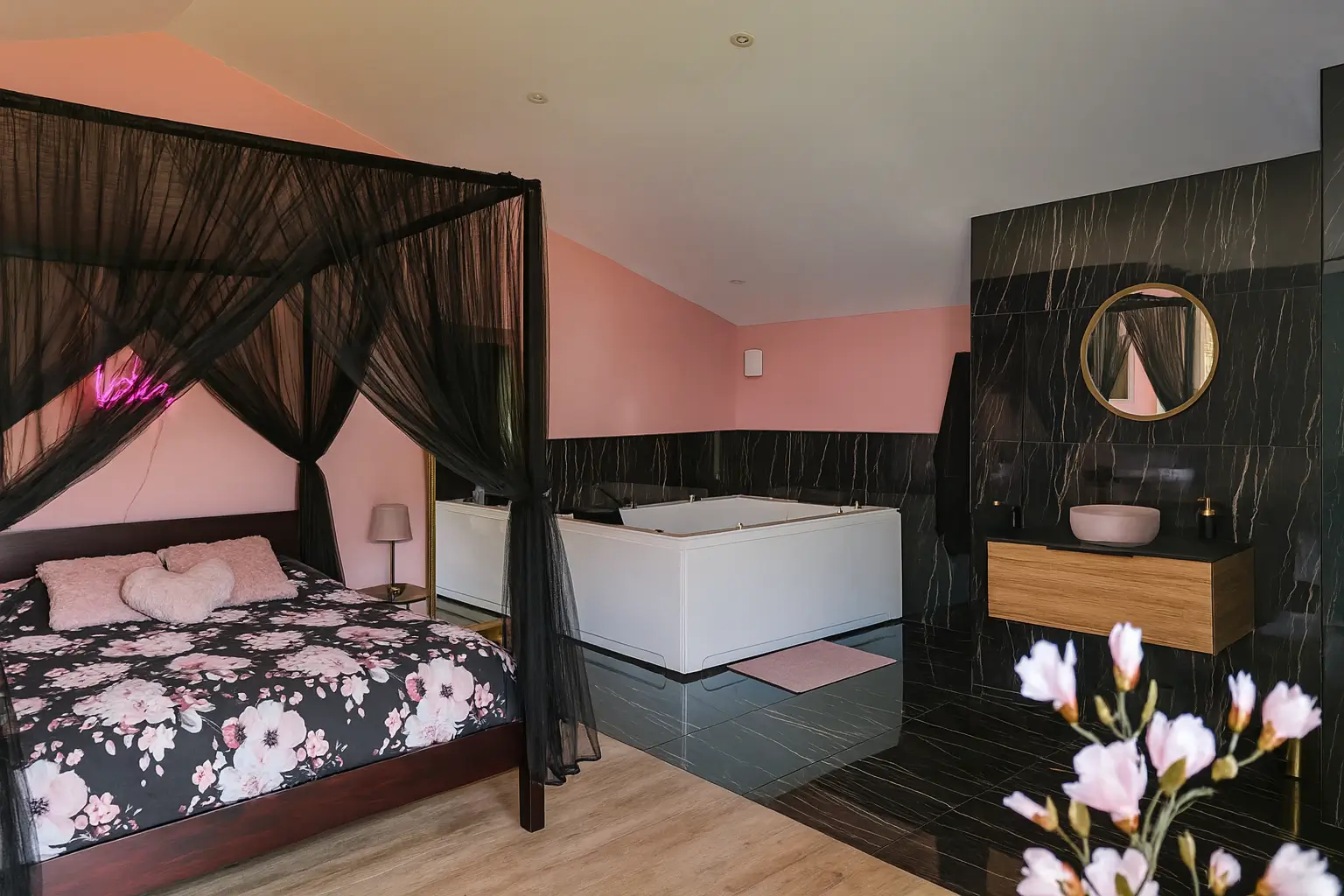 Le lieu offre bien-être et détente avec sa baignoire balnéothérapie, sa douche à l’italienne équipée de luminothérapie et son ciel étoilé. Un jacuzzi privé complète cette expérience sensorielle unique.